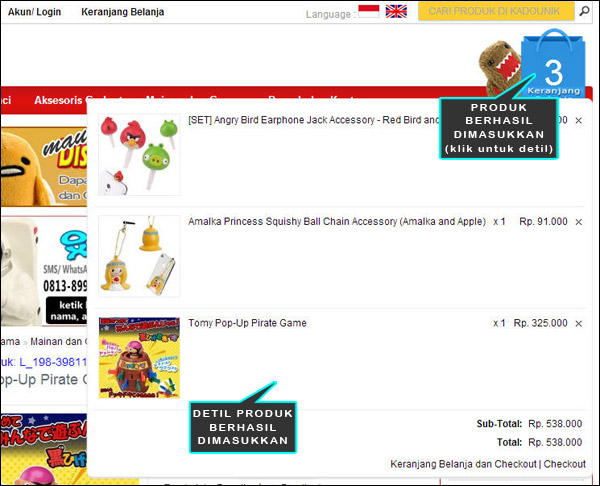 Kalian juga bisa lansug mengklik gambar "KERANJANG BELANJA" untuk melihat produk yang sudah dimasukkanke dalam KERANJANG BELANJA. |