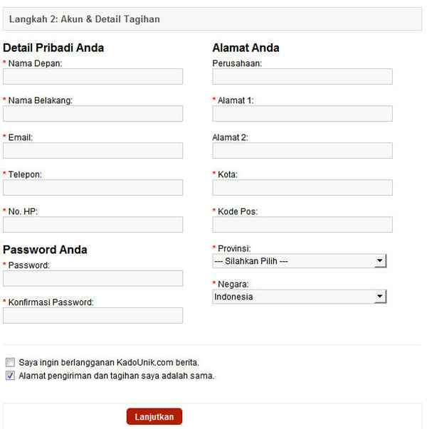Pastikan beberapa hal: 4. Penulisan KOTA yang salah atau tidak ada dalam database KadoUnik akan mengakibatkan proses tidak dapat dilanjutkan, apabila ini terjadi bisa langsung menghubungi KadoUnik melalui email atau SMS di 0813-89990090. |