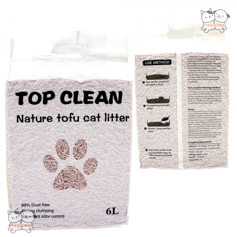 Pasir kucing Tofu Top Clean (cat litter) adalah pasir kucing yang dikenal ramah lingkungan dikarenakan menggunakan bahan baku kacang kedelai (soya bean) yang bisa terurai sehingga aman bagi lingkungan.