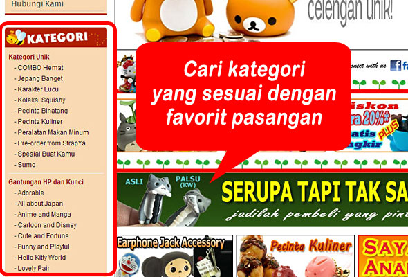Misalnya pasangan kalian termasuk pecinta binatang maka kalian bisa mengklik kategori "Pecinta Binatang" dan kalau sukanya anjing atau kucing maka kalian bisa langsung memasukkan kata kunci "anjing / dog" atau "kucing / cat" di kolom pencarian yang ada di atas. Dengan begitu, kalian bisa memilih sendiri mana yang paling cocok diantara semua yang ada di KadoUnik.